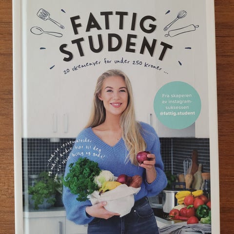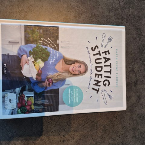 Karen Elene Thorsen Fattig student kokebok. Boken inneholder oppskrifter og tips til rimelige og enkle måltider, med fokus på matlaging som passer for studenter og andre som ønsker å holde matbudsjettet nede. Innbundet utgave fra forlaget Pilar.