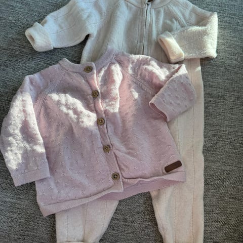 Pent brukte klær til jente str 74. Diverse bukser, to jakker, bodyer i ull og bomull, pysjer, en balaclava i myk ull og en strømpebukse.