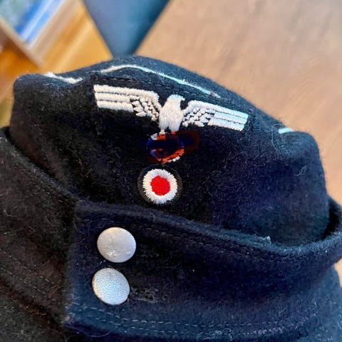 Selger en tysk oppbevaringspose i stoff fra ww2 som ble brukt til oppbevare luemerke eller medaljer.