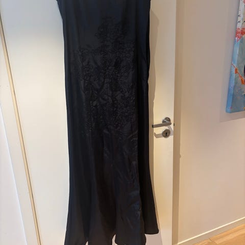 Part Two festkjole i svart fløyel i størrelse M. Kjolen har omslagsoverdel med V-utringning og knyting i livet. Lange ermer med brede mansjetter. Mykt fløyelsmateriale som gir en jevn og glatt overflate. Passer til dame og er egnet til bruk ved formelle anledninger og festlige sammenkomster.