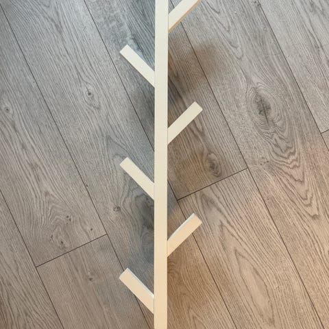 Medfølger oppheng som gjør at det blir avstand fra veggen (se bilde 2) - som gjør den ekstra fin og kan minne noe om Swedese tree klesstativ vegg.