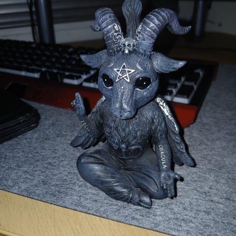 Figur dekorasjon i mørke farger med horn og detaljerte ornamenter. Den ene figuren er formet som en and med horn og utskårne symboler, hovedsakelig i svart med rødlige detaljer. Den andre figuren kan følge med i tilleg i pris.
