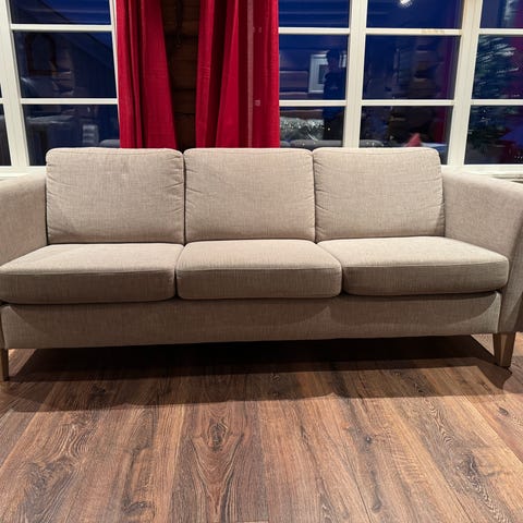 Flott sofa ca 2 år gammel. I lyst stoff. Som ny ingen flekker.