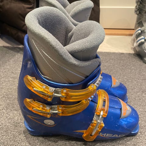 Head alpinstøvler i blå plast med justerbare spenner i gul/oransje plast og metall. Støvlene har hard ytterskall og mykere innersko for støtte og komfort. Sålen har gummipartier for bedre feste ved gange. Egnet til bruk med vanlige alpinbindinger i skibakken.