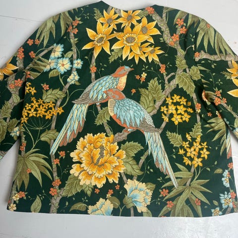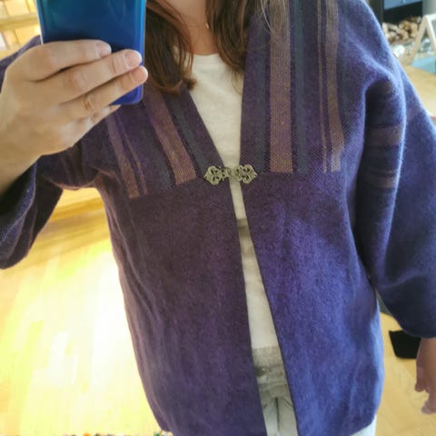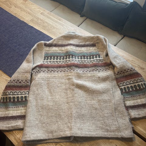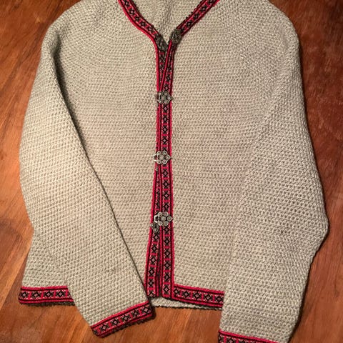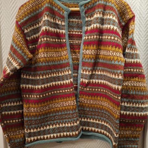 Original Jakke sydd på 40/50 tallet av hjemmevevd stoff. Virker å være av ull, muligens iblandet litt lin?