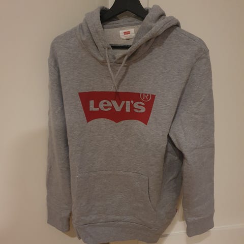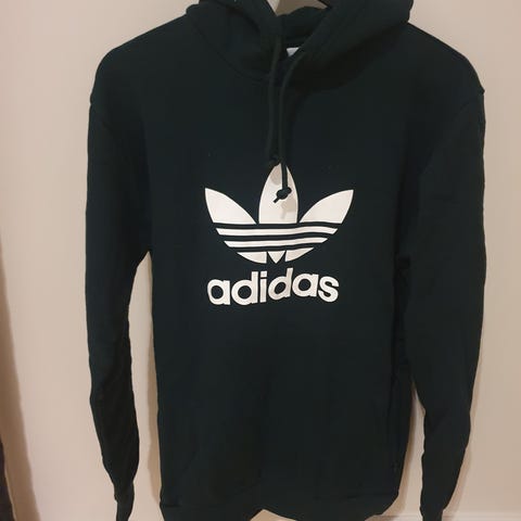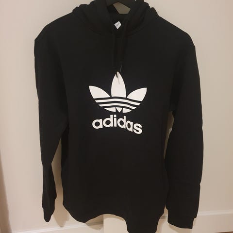 Adidas hettegenser for herre i størrelse M. Genseren er grå med stor Adidas-logo på brystet. Modellen har hette med snøring og stor kengurulomme foran. Passer til hverdagsbruk og fritid.