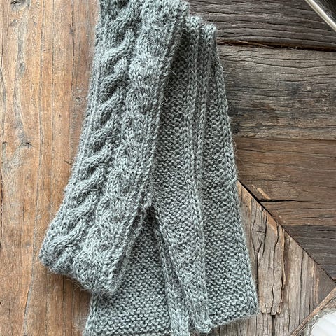 Hjemmestrikket, grått skjerf i finull/ alpakka med fine detaljer i kabelstrikk.