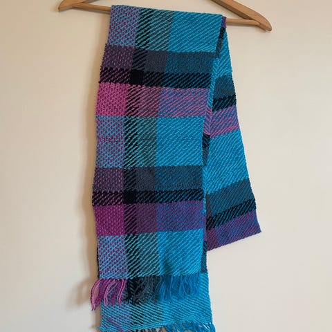 Håndvevd egen design i mohairull for dame.og herre kun et eksemplar da alle veves med varierte oppdelinger/felt. Skjerfet er blått med diverse blåfargepartier og innslag av mørkere nyanser. BurgunderDet har frynser i endene og er vevd i et mykt materiale av 100% Finull og ktøllmohair Egner seg som tilbehør til yttertøy eller som varmende skjerf innendørs. Størrelse er lengde 185cmskjerfet kan brukes av de fleste uavhengig av klesstørrelse.Fint til hun og han