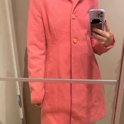 Oasis kåpe for dame i størrelse M. Kåpen er svart og laget i polyester. Modellen har dobbeltspent knappelukking med dekorative knapper foran, krage med slag og markert liv. Den har sidelommer og rekker omtrent til midt på låret, avhengig av høyde. Egner seg som yttertøy i overgangssesonger og mildere vinterdager. (AI skrevet).