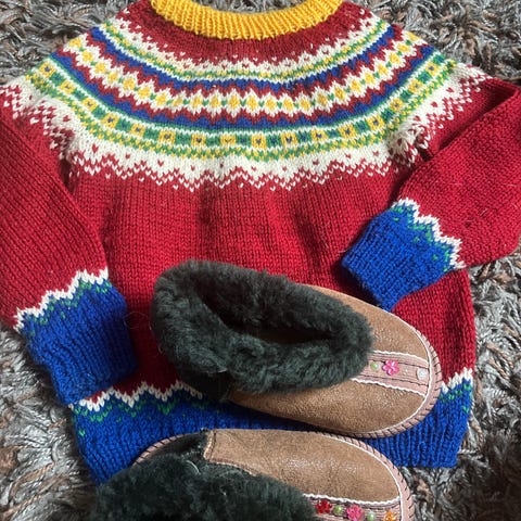 Selger to unike, håndstrikkede ullgensere i størrelse ca. 3-4 år. Dette er kvalitetsplagg laget med omtanke – tidløst design og ekte håndarbeid som varer.