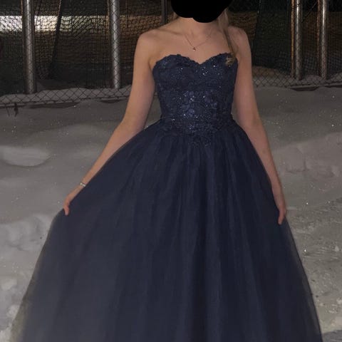 Vi selger en nydelig ballkjole fra Alexandra Ritzi, modellen heter Raya. Overdelen har lekre blonder og er hjerteformet. Korsettet gir en fin midje. Snøring bak gir rom for justering. Den sitter godt på kroppen og er behagelig å ha på. Skjørtet har flere lag med tyll.