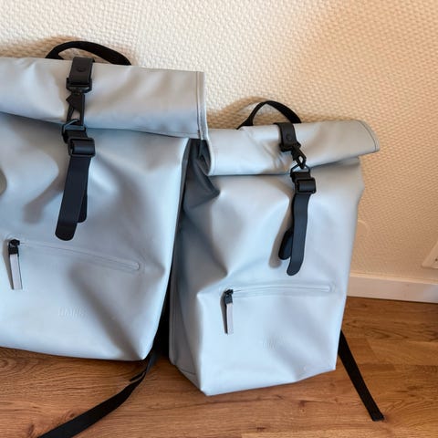 Rolltop fra Rains i en kjempefin grønnfarge. Som det meste fra Rains så er den vanntett og har praktisk lomme for pc/mac på siden. Veldig lite brukt og lite/ingen slitasjemerker