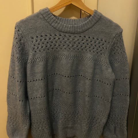 Fin pent brukt genser i akryl/bomull (tror jeg - lappen er borte). Noe romslig XL. Nydelig blondestrikk i ermene. Ikke hjemmestrikket. Myk og ganske tynn. Ingen lapper i den, så merke vet jeg ikke. Lys blå farge, blir litt blass på bildene, den har litt dypere farge. Bra lengde, og den har stretch.