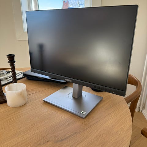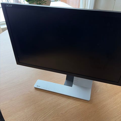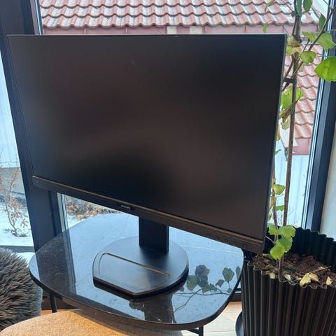 AOC skjerm på 27 tommer. Skjermen har en tynn ramme og står på en vinklet fot i metallfarge. Egnet som dataskjerm til kontorbruk, hjemmekontor eller generell PC‑bruk. Kommer med strømkabel.