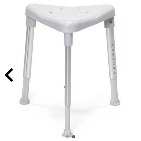 Etac dusjkrakk med armlener i grå plast. Krakken har stabilt sete med dreneringshull og utsparing i front for enklere intimvask. Høyden på beina kan justeres ved hjelp av trinnvise innstillinger, og føttene har gummiknotter for bedre stabilitet på vått underlag. Egnet som sittehjelp i dusj eller bad for personer med behov for ekstra støtte ved personlig hygiene.