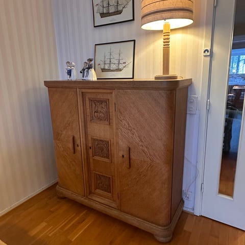 Skjenk i tre i lys brun utførelse. Møbelet har avrundede hjørner og profilerte ben, samt tre dører hvor den midterste har utskåret dekorfelt. Ca. mål: bredde 155 cm og høyde 67 cm (angitt på bilde). Egner seg som oppbevaringsmøbel i stue, spisestue eller gang, med god plass til servise, tekstiler eller annet utstyr bak dørene og på topplaten.
