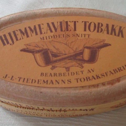 Gammel uåpnet tobakksboks fra Drammens Tobakkfabrikk