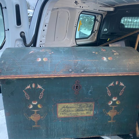 Røverkjøp.. Malt trekiste brystkiste med lokk og rom fra år 1866