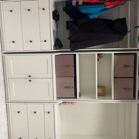 Skap i heltre tidligere brukt i en butikk, nå gjort om til et garderobeskap. Skapet har ikke vondt av å få litt kjærlighet, men har likevel mange gode års bruk igjen. Hylleplatene er løse og kan justeres i høyde.