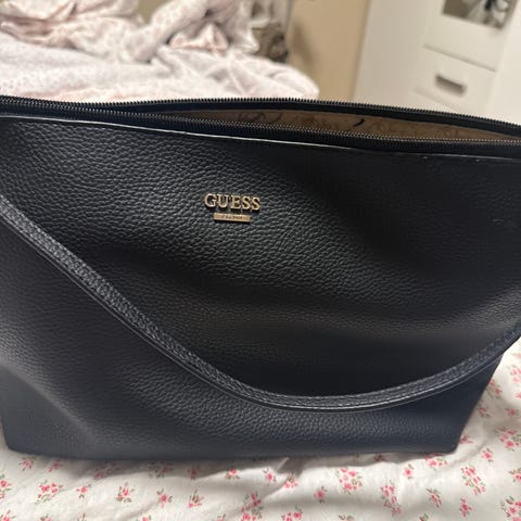Guess håndveske i kunstlær for dame. Vesken har flettet struktur i materialet og er gullfarget med metalliske detaljer. Den har doble bærehåndtak med nagler, dekorativ spenne på forsiden og glidelåslomme på baksiden. Lukkes med magnetklaff øverst. Egnet som hverdagsveske eller til bruk når man trenger en romslig veske til personlige eiendeler.