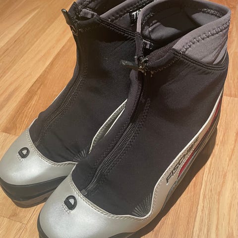 Fischer langrennsstøvler i størrelse EU 39. Støvlene har svart yttermateriale med gul innside og detaljer. De har glidelåslukking foran og kraftig såle tilpasset langrenn. Egnet for bruk på ski i preparerte løyper. Passer til junior eller voksen med skostørrelse 39.