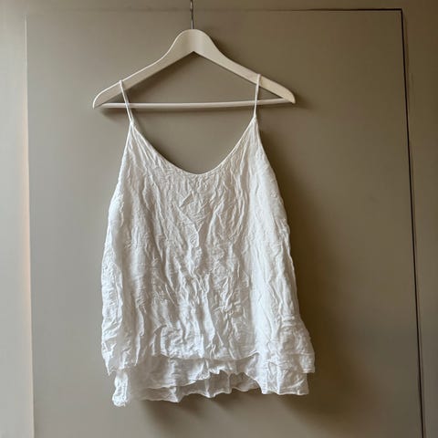 Mørkeblå singlet fra Vintage Stories i str M. Tykt, glinsende stoff som nesten ser ut som silke. Dobbelt lag over brystet gjør at den kan brukes uten BH. Spagettistropper.