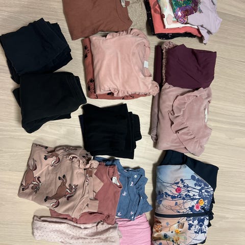 klespakke i størrelse 140, flerfarget. Pakken inneholder ulike plagg for jente, blant annet overdeler og underdeler i forskjellige farger og snitt. Klærne passer til hverdagsbruk og kan kombineres på flere måter. Alle plaggene er i størrelse 140 (eller brukt i samme periode)
