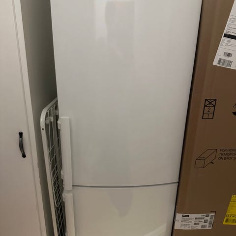 Candy kombiskap kjøleskap og fryser i hvit utførelse. Gis bort grunnet behov for større fryser. Skapet har separat kjøledel og frysedel med egen dør for hver del. Kjøledelen har flere hyller for oppbevaring av matvarer, mens frysedelen har hyller/rom for innfrysing og lagring av frossenmat. Egner seg til bruk på kjøkken, i bod eller som ekstra kjøle- og frysekapasitet i hjemmet.