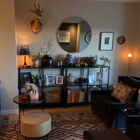 Dings i tre som henges på veggen og kan holde en vinylplate. Veldig lett tre. Limfeste bak. Kjøpt på Etsy, ikke prøvd. Det første bildet er lånt for å vise hvordan den ser ut på vegg.