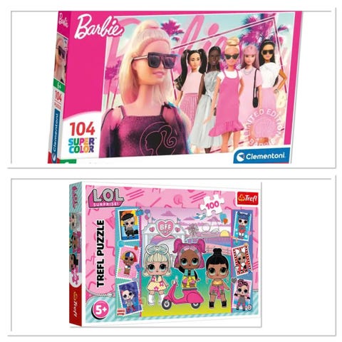 Selger Barbie puslespill fra Clementoni med 104 brikker.