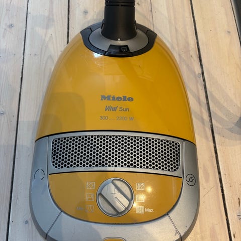 Miele Classic C1 støvsuger i rød farge. Modellen er en tradisjonell gulvstøvsuger med pose, teleskoprør i metall og fleksibel slange.