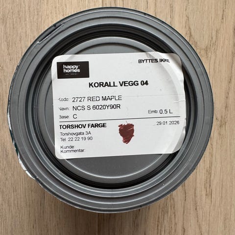 Happy Homes Korall Vegg 04 veggmaling i spann på 0,5 liter. Maling beregnet for innvendige vegger. Fargekode NCS 1220-Y20R / 0552 Tudor. Egnet til bruk på veggflater der det ønskes denne fargen og glansgraden som følger Korall Vegg-serien.