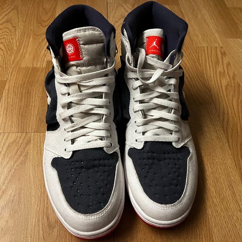 Nike Jordan sneakers i størrelse 40. Høye joggesko med snøring og kraftig såle. Fargene er blå, hvit og rød med Nike-logo på sidene og Jumpman-logo på pløsen. Overdelen består av syntetisk materiale og tekstil, med polstret hælparti og pløse for økt komfort. Passer til hverdagsbruk og fritidsaktiviteter.