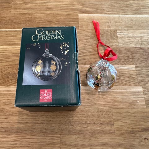Tre glasshjerter fra Holmegaard med gull og røde detaljer.