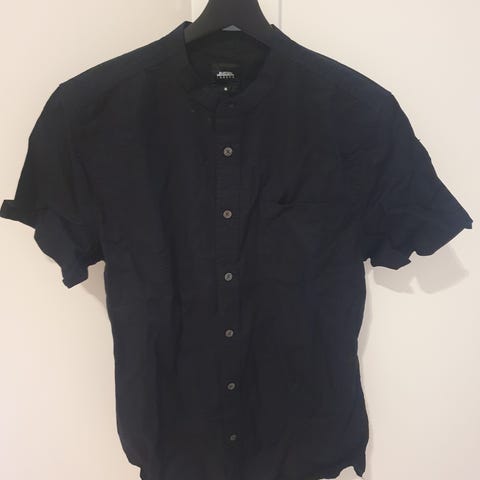 Skjorte for herre i størrelse M. Skjorten har flerfarget mønster på mørk bunn og lange ermer. Passer til hverdagsbruk eller mer formelle anledninger avhengig av styling. Materiale er ikke oppgitt.