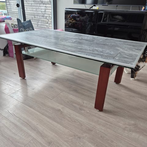 Oprinnelig sort, malt rosa. Trenger ny maling ellers laget i tre og er solid, har en oppaveringshylle