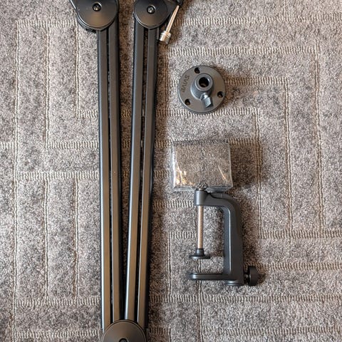 Universalt tilleggsutstyr i svart metall/plast, egnet som feste- og monteringsarmer til kamera eller annet utstyr. Settet består av flere justerbare armer og fester som kan brukes til å montere utstyr på bordkant eller lignende flater. Passer som ekstrautstyr der det er behov for fleksibel plassering og vinkling av enheter.