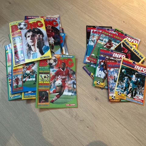 United Supporteren Manchester United supportermagasiner samling. Pakken består av flere utgaver av medlems- og supportermagasinet «United Supporteren», med innhold relatert til Manchester United, kamper, spillere, intervjuer og klubbhistorie. På bildene vises blant annet et spesialhefte om «Sir Alex Ferguson – Manager 25 år». Magasinene er trykket i farger på papir og er i magasinformat. Egner seg for samlere av fotball- og Manchester United-litteratur eller for de som ønsker referansemateriell om klubben og dens historie. Over 50 blad/hefter og kalendere. Mulig det er noen som mangler en plakat.