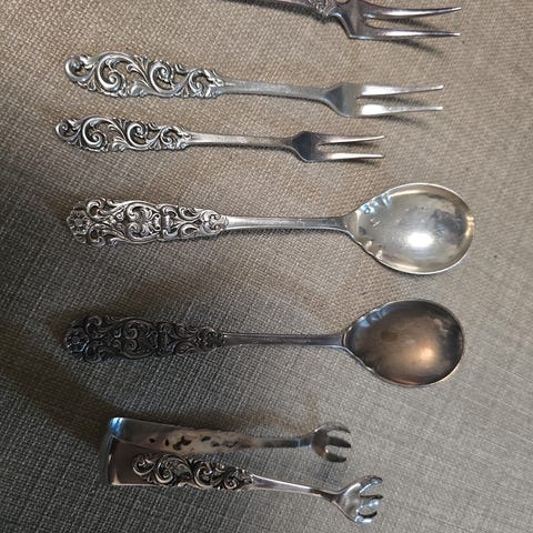 Skjeene er på 78 gram. Lengde på de: 21,5. Vil helst møte deg in person for overlevering ev planlegge en trygg måte å sende på, kjøpers ansvar. Selges samlet helst, men også stykkevis, 2000 kr gaffel og 1800 skje. Kom gjerne med prisforslag om du vil kjøpe de samlet.
