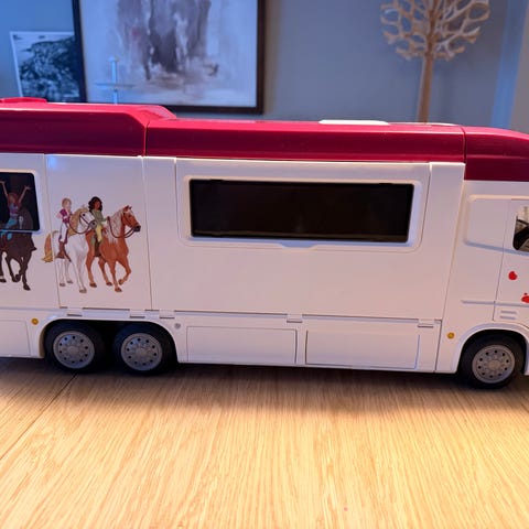 Barbie campingbil lekebil i rosa plast. Bilen kan åpnes og har innredning som kjøkken, oppbevaringshyller og baderomsdel med toalett. Passer til lek med Barbie-dukker og andre dukker i tilsvarende størrelse. Egnet for innendørs lek på gulv eller bord.