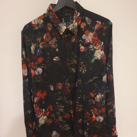 H&M skjorte for herre i størrelse M. Skjorten er svart med blomstermønster i kontrastfarge. Langermet modell med krage og knepping foran. Passer til både hverdagsbruk og mer formelle anledninger, avhengig av styling.