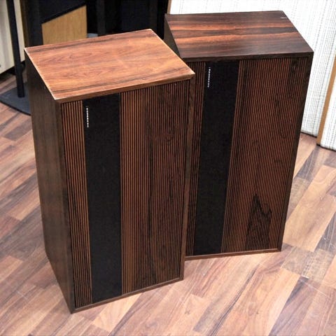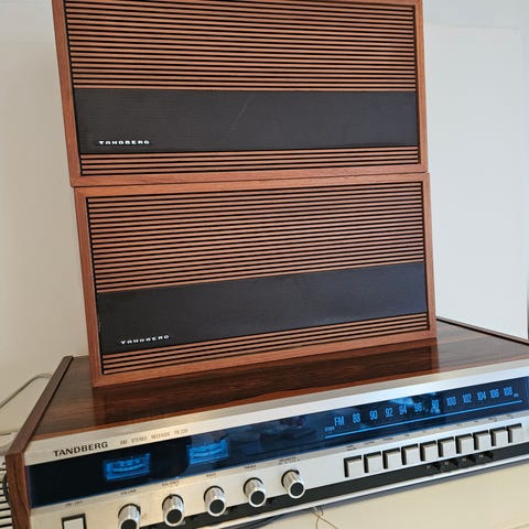 Tandberg høyttalere system 20 i klassisk rektangulært design med front i sort og horisontale riller. Kabinettet er i nydelig brun trefinish. Passer som stereohøyttalere i stue eller lytterom. Egner seg til bruk sammen med forsterker eller receiver som har tilkobling for passive høyttalere. Tandberg Receiver kan fås med mot tillegg i prisen. Ligger ute til salgs.