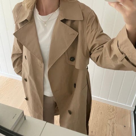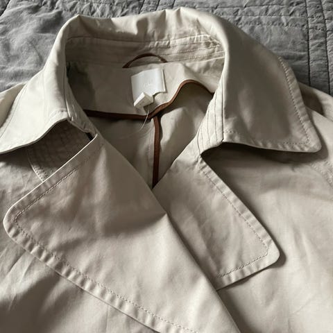 Oversized, dobbeltspent trenchcoat med ballongermer fra H&M. Løst bærestykke bak med legg. Lav skuldersøm, avtakbart knytebelte i midjen, skråstilte lommer foran med klaff og enkel splitt bak. Fôret.