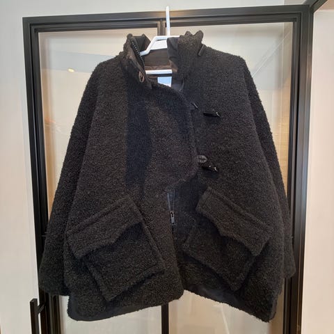 Ganni ytterjakke for dame i størrelse 40. Kanskje litt liten i str (jeg bruker vanligvis 38). Modellen er vattert med quiltede sømmer og har hette. Den er ikke dun, men varm