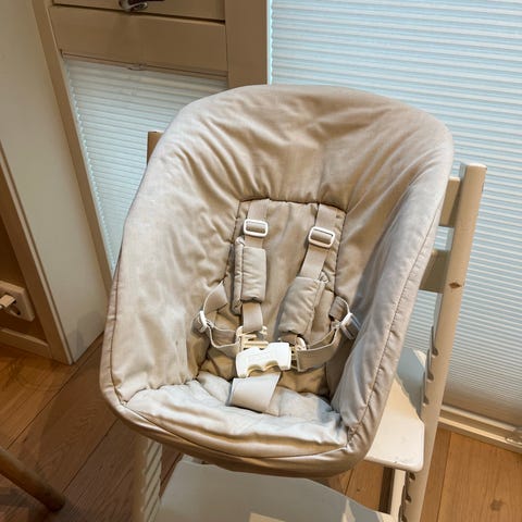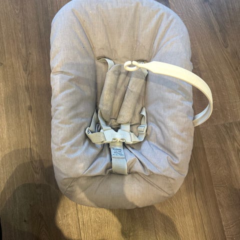 Stokke barnestol Newborn Set i grå tekstil. Setet har integrert 5-punkts sele og plastbase for montering på Stokke-stol. Egnet for nyfødte og små barn innenfor vektgrensen angitt av produsenten. Tekstiltrekket er avtagbart. Leveres med bøyle/festearm for montering av leker.
