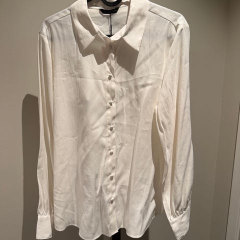 Zara skjorte for dame i størrelse L. Skjorten er hvit og har kort erm, knappestolpe foran og brystlomme. Lett og luftig vevd stoff som passer godt til hverdagsbruk eller som en enkel overdel over topp eller singlet. Klassisk fasong med krage og avrundet kant nederst.