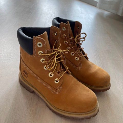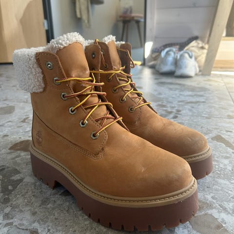 Timberland støvler i størrelse 39,5. Klassiske brunfargede skinnstøvler med snøring og kraftig yttersåle. Polstret ankelparti for økt komfort. Egnet som hverdagsstøvler og til bruk i kjøligere værforhold.