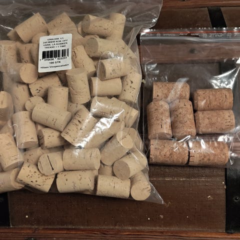 Pose med en samling av 16 brukte korker fra vinflasker.