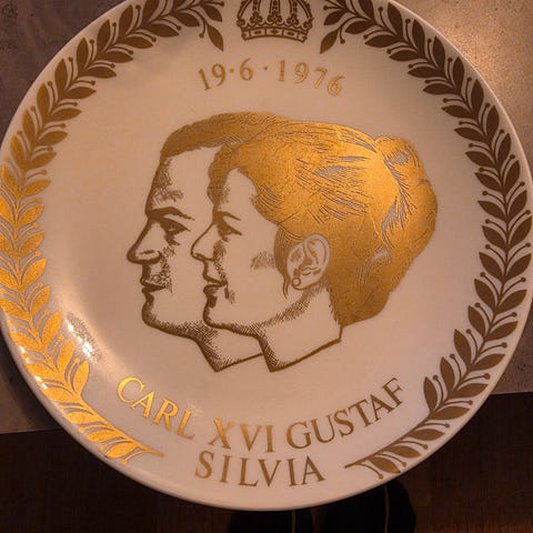 Platte i porselen laget for Oslo Militære Samfund 175 jubileum. Tallerkenen markerer 175-årsjubileet 1. mars 2000. Ble gitt til gjester under jubileumsmiddagen. Baksiden er merket Porsgrund. Platten er 17 cm i diameter.
