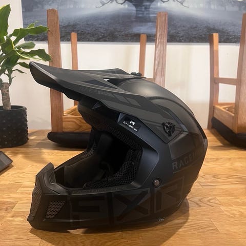 Helhjelm motorsykkelhjelm i matt svart farge. Hjelmen har hel front med integrert hakebeskyttelse og ventilasjonsåpninger foran, på sidene og på toppen for luftgjennomstrømning. Innvendig er det polstret fôr og kinnputer for bedre passform og komfort. Ytterskallet er i hardplast/komposittmateriale med markerte linjer og spoiler bak. Leveres med hjelmtrekk som vist på bildene. Egnet til motorsykkel, cross eller lignende bruk der helhjelm er påkrevd. Størrelse og eksakt modell er ikke oppgitt og bør kontrolleres før bruk.
